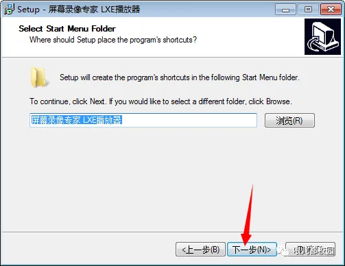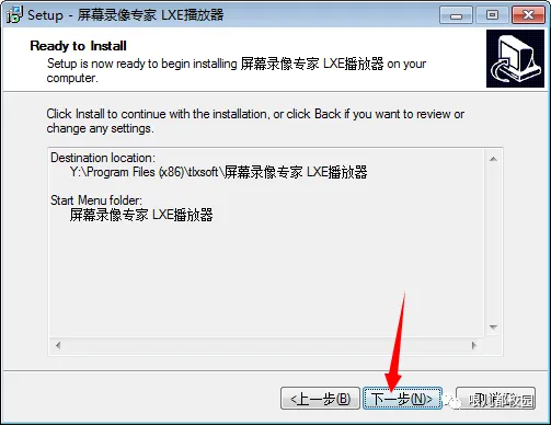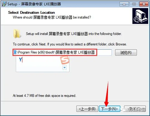 12.选择安装目录,默认安装在 C:\Program Files (x86)\tlxsoft\屏幕录像专家 LXE播放器(建议安装在除C盘以外的磁盘上,可以直接将C改成Y,安装到Y盘),然后点击“下一步”