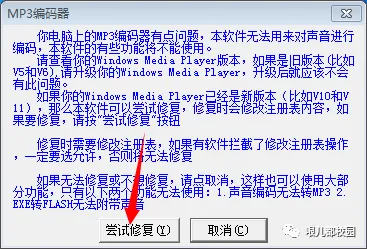 19.如出现“MP3编码器”显示框,点击“尝试修复”
