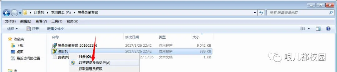 26.再次打开“屏幕录像专家”文件夹,鼠标右击“注册机”,选择“以管理员身份运行”