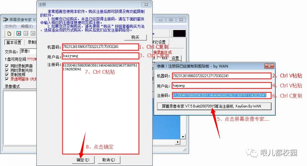 27.把机器码“Ctrl C”复制,“Ctrl V”粘贴到注册机里面的机器码;把用户名“Ctrl C”复制,“Ctrl V”粘贴到注册机里面的用户名;然后点击“屏幕录像专家V7.5Build20070915算法注册机 KeyGen By WAN”;再将注册机生成的注册码“Ctrl C”复制,然后“Ctrl V”粘贴注册码,最后点击“确定”即可。