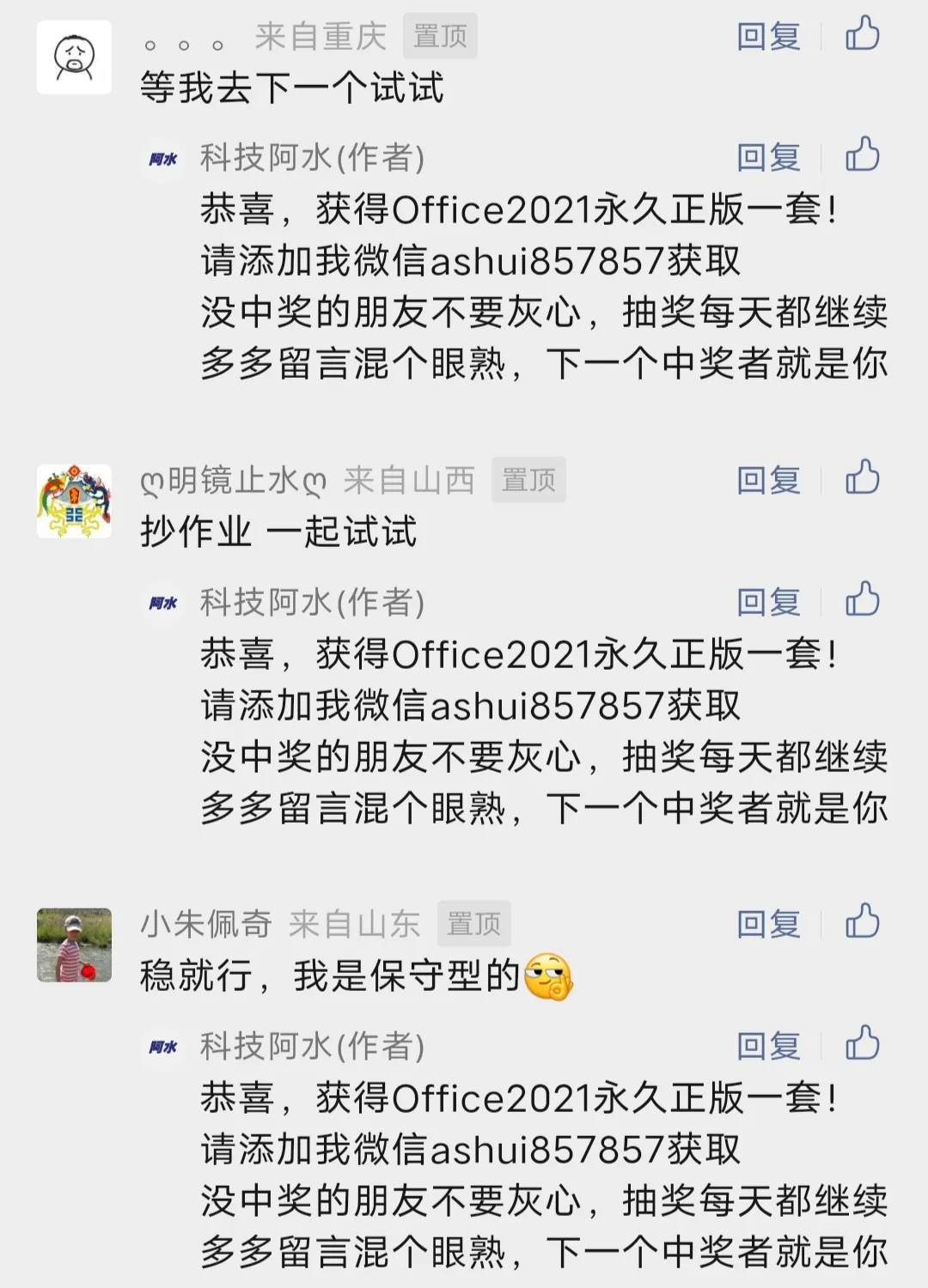 昨天中奖粉丝如下,阿水每天会在点赞+留言的粉丝中,抽取一位赠送Office2021永久正版一套,并置顶留言公示,请大家踊跃参与!
