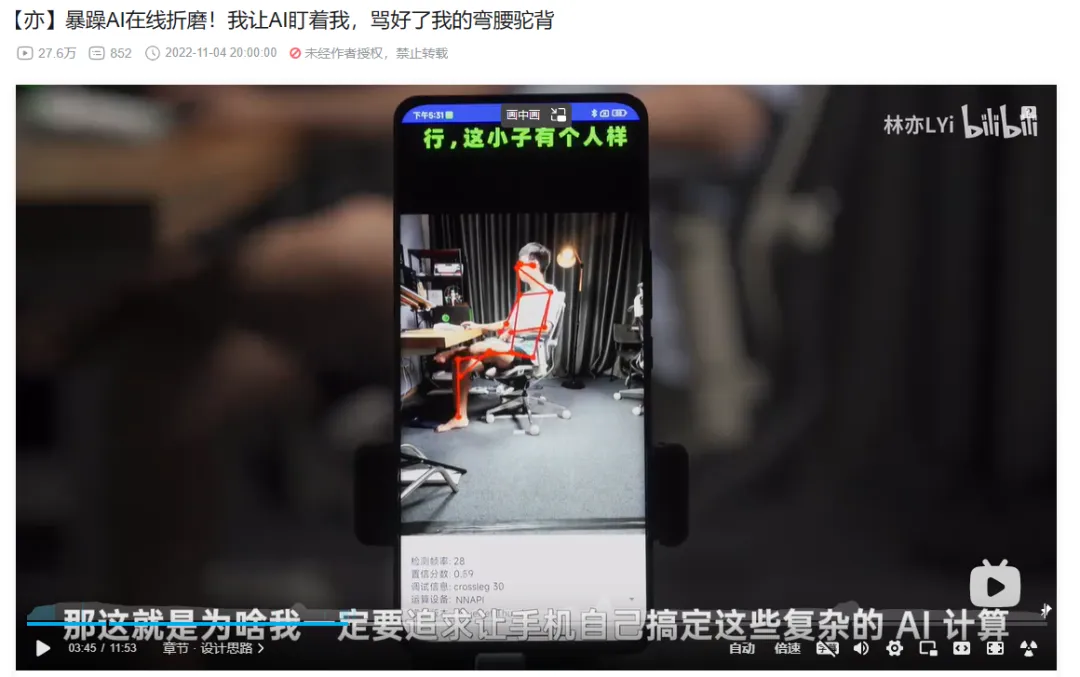 B站大佬@林亦LYi开发的一款AI软件,可以利用手机摄像头来检测人的坐姿是否标准,并自动提醒矫正。