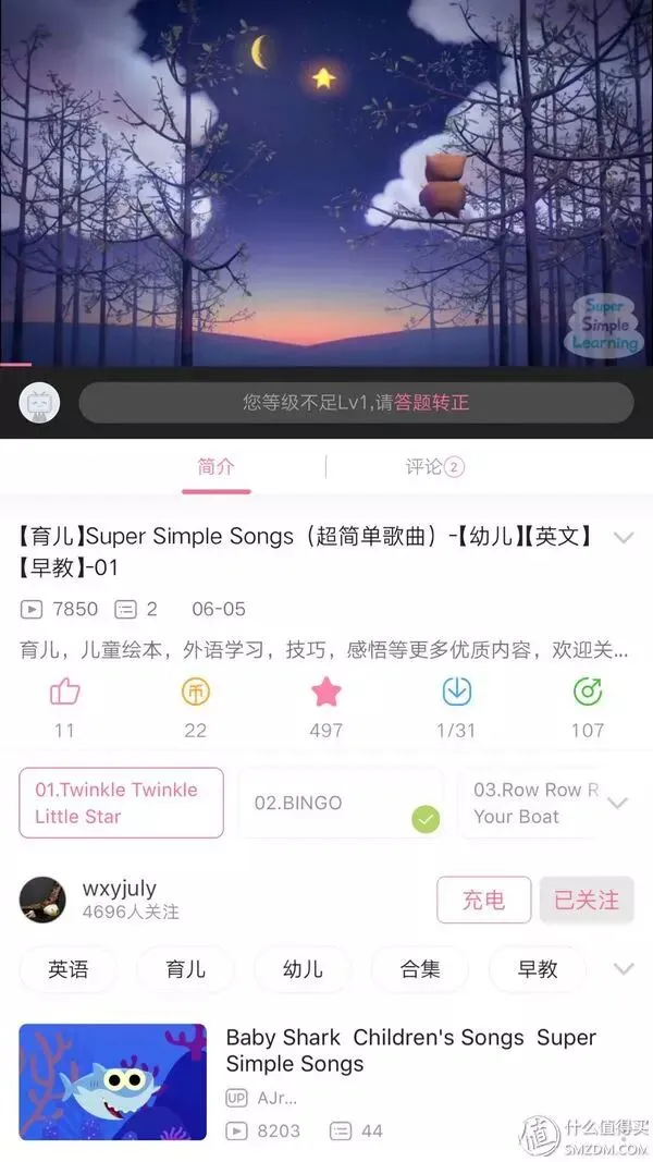 对,你没看错,是B站。我在微博上面关注的“澳洲妇幼DR韩”经常发布一些国外的儿歌动画,其中“super simple song”最有名,于是我就在网上找完整版,然后就发现B站有这个系列,看了不久,这孩子居然能自己哼出“Twinkle,twinkle, little star, How I wonder what you are”的歌词了。这一系列的儿歌都是朗朗上口的经典英文儿歌,画面也很不错,强烈推荐!