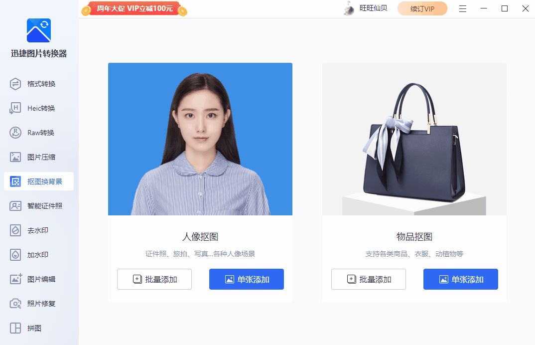 【迅捷图片转换器】软件还有抠图功能,可以批量进行人像和物品图片的抠图操作: