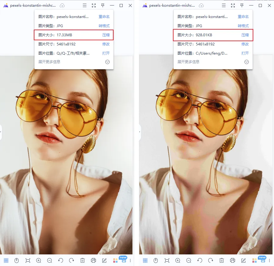 给大家看看这个压缩前后的对比,从17.33MB缩小到只有928.01KB!(你们自己算算缩小多少倍吧…小小迅大脑不够用了…)而且图片还是很清晰,是不是很厉害~