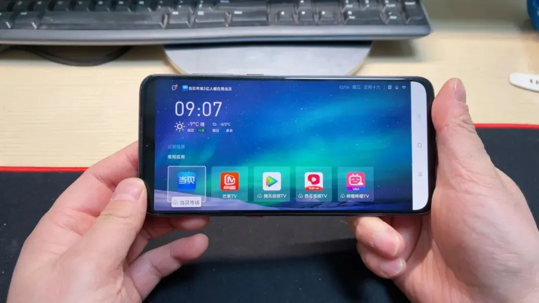 首先我们来先解决第一个问题,因为手机现在是竖屏的一个状态,如果我们要投影到电视的话,是手机是变为横屏才可以进行投放,我们可以下载一个当贝桌面APP,然后我们打开这个桌面以后,大家可以看一下,手机会自动的变成一个横屏,和电视的效果是类似的,大家可以看一下,在这里边可以下载一些电视上的应用,这样的话第一步就解决了,这是第一步该解决的问题。