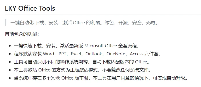LKY Office Tools是一款来自Github的Office安装与激活工具,仅需一个软件,所有问题,一网打尽!