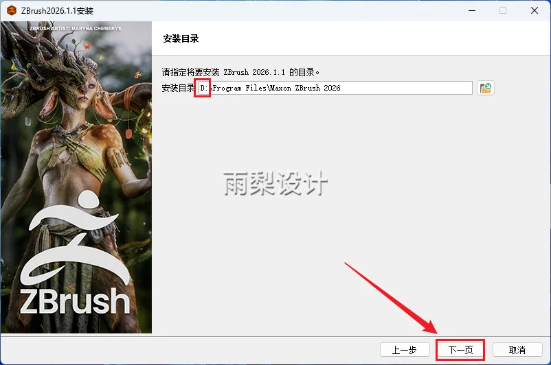 6.把安装路径前面的C字母改成D;点击【下一页】