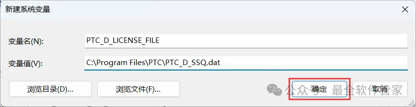 13、变量名输入:PTC_D_LICENSE_FILE,再点击【浏览文件】