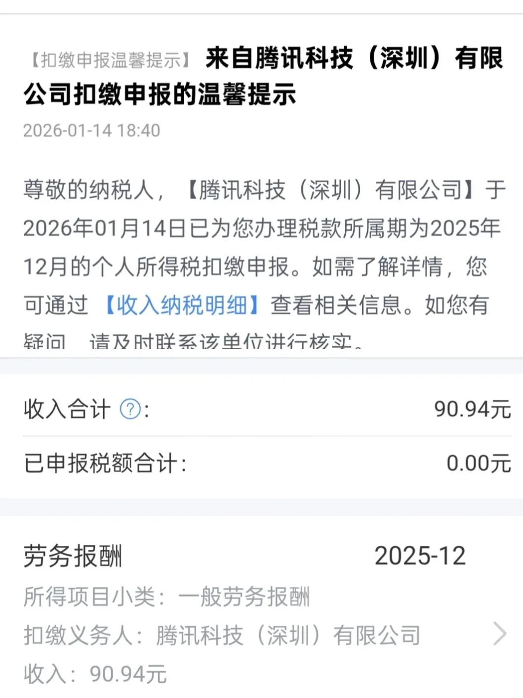 消息栏跳出两条,一条是专项附加扣除自动代入确认提醒,另一条居然是腾讯扣缴温馨提示。