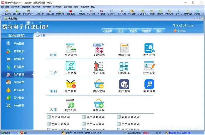 与单纯的销售企业不同,生产企业除了采购和销售,还需要重点管理生产环节。为此,易特电子行业ERP应运而生,这是一款专为电子生产型企业量身定制的ERP管理软件。它涵盖了客户和供应商的基本信息建档、采购入库、采购退货、销售出库、销售退货、售后维修、外发加工、来料加工以及财务管理等多个核心模块。软件的界面设计灵活,用户可以根据自身需求自定义表格布局,甚至可以根据企业特点设计打印格式,极大地提高了工作效率和管理的便捷性。