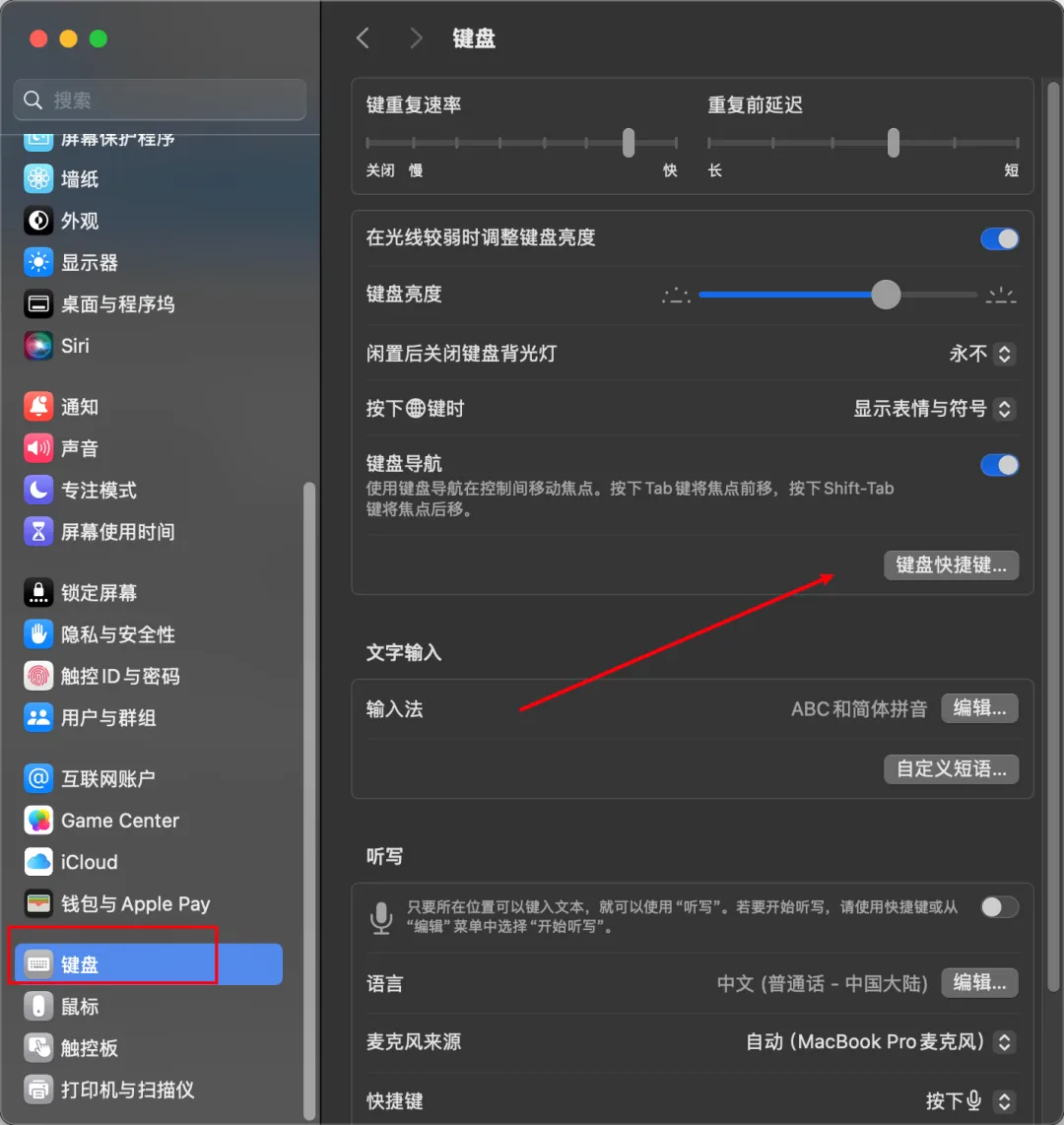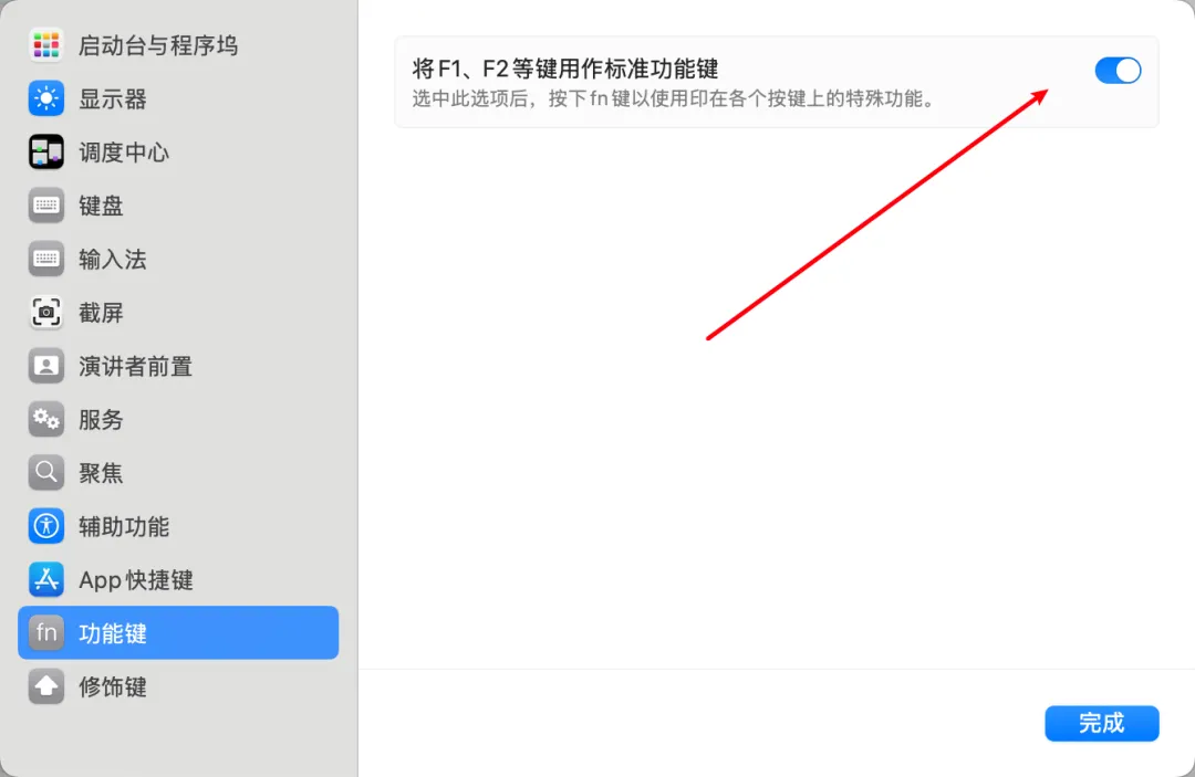 默认情况下,mac book对应的F1~F12对应的是灯光、音量等操作的调整,作为开发我们常见的快捷操作都依赖于这些键位(如F5刷新、F12开发者工具等),所以我们需要将其设置为标准功能,而要想执行特殊功能(如调节音量、亮度)则需要配合fn键位。所以在正式演示macOS快捷操作之前,我们需要先针对F1~F12进行配置调整。
