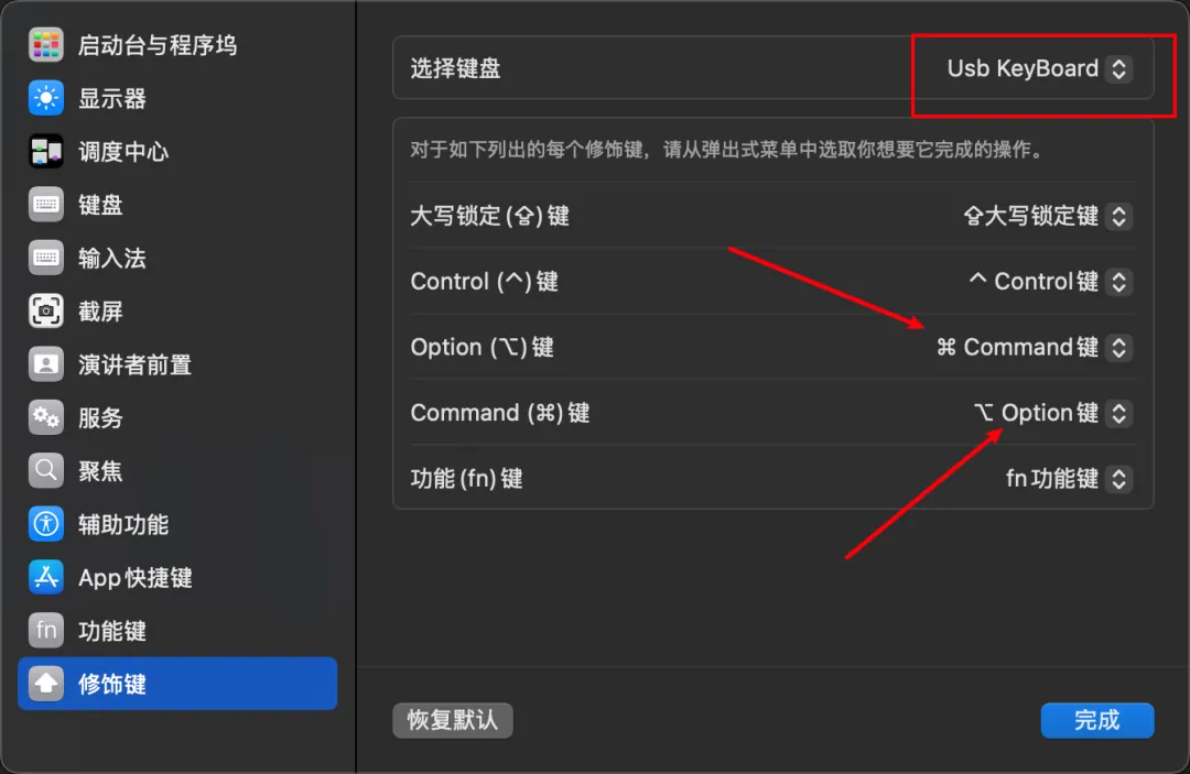 Mac外接USB键盘修饰键设置 Option 和 Command 替换:https://blog.csdn.net/liuwei0376/article/details/124155195