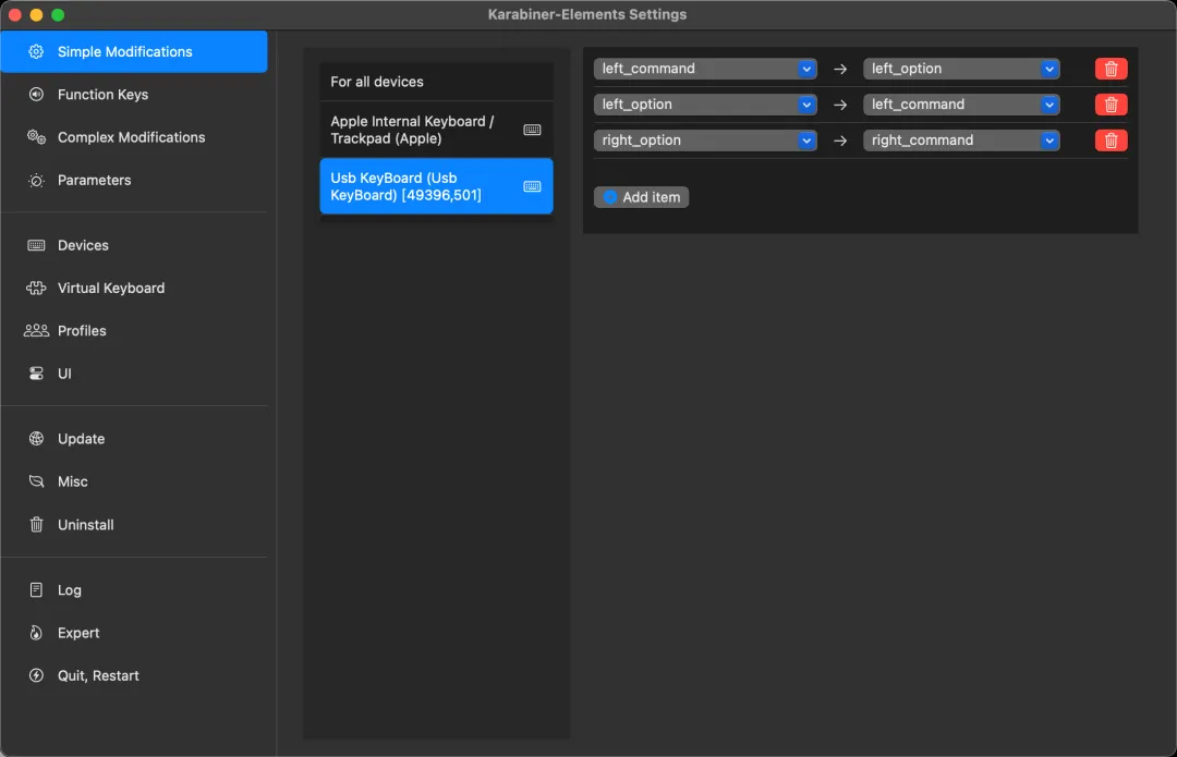 结合键盘的布局不难看出,两者键盘上的区别无非是这两个键位的位置颠倒了而已,所以我们可以通过Karabiner-Elements将win键盘的布局改为mac的即可,所以对应的调整思路为: