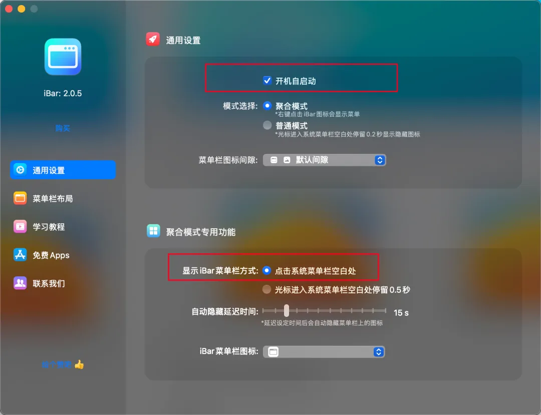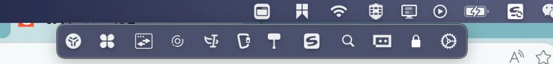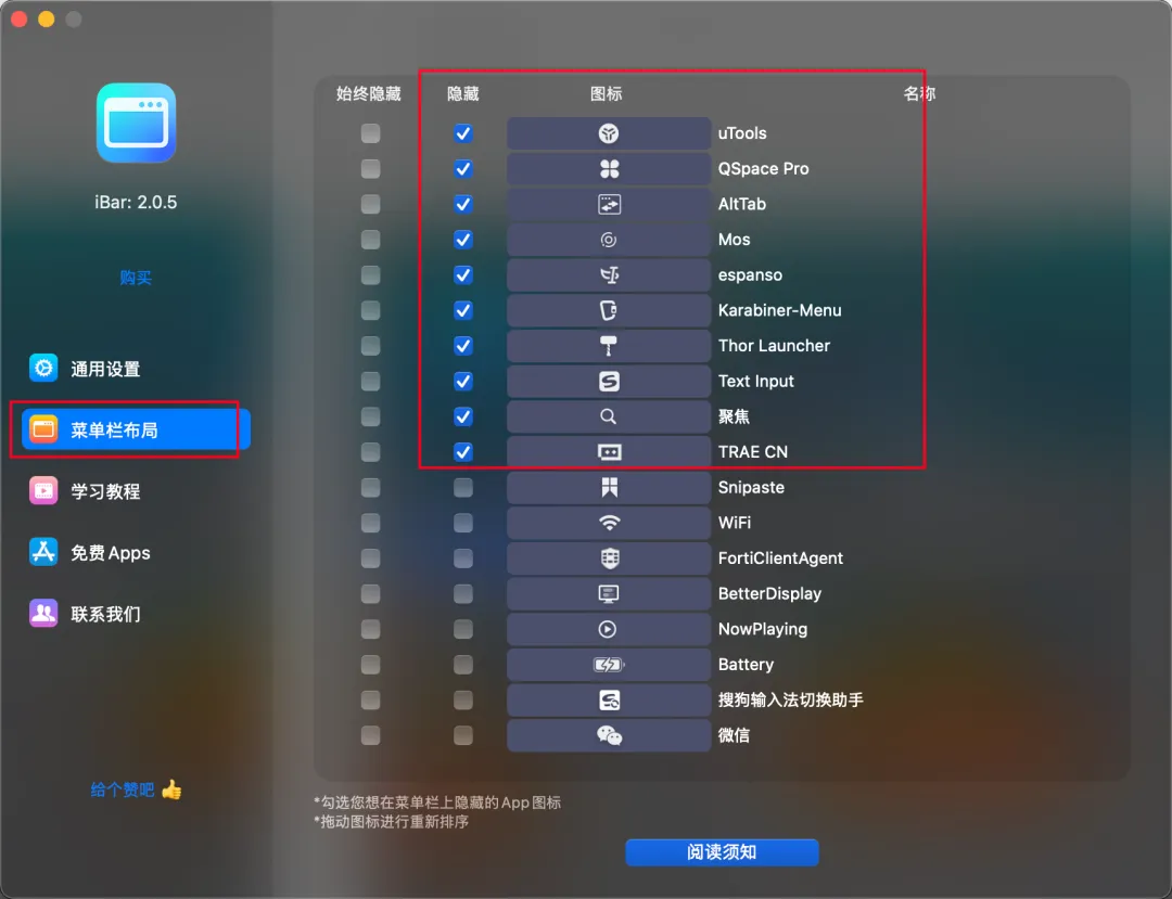 与windows系统不同,mac菜单栏位于系统正上方,碍于系统局限性,笔者发现mac book在多开程序的情况下,在笔记本屏幕上菜单栏应用程序会显示不全,查阅网上的解决方案,最终还是选择了下载安装一个菜单栏管理工具ibar,如下所示: