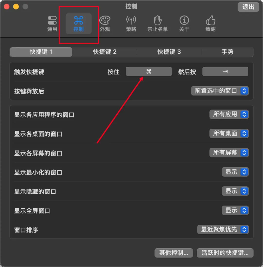 完成后,打开工具选择控制,将快捷键1改为⌘+tab替代mac os原生窗口管理: