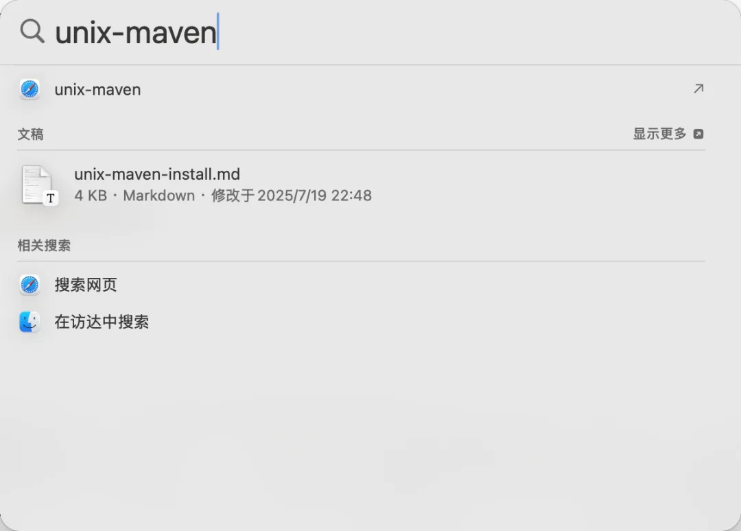 然后在聚焦搜索栏中输入自己要定位的文件或者程序,以笔者为例,对应搜索的就是unix系下的maven安装文档,直接输入文件名,即可直接快速定位到该文件: