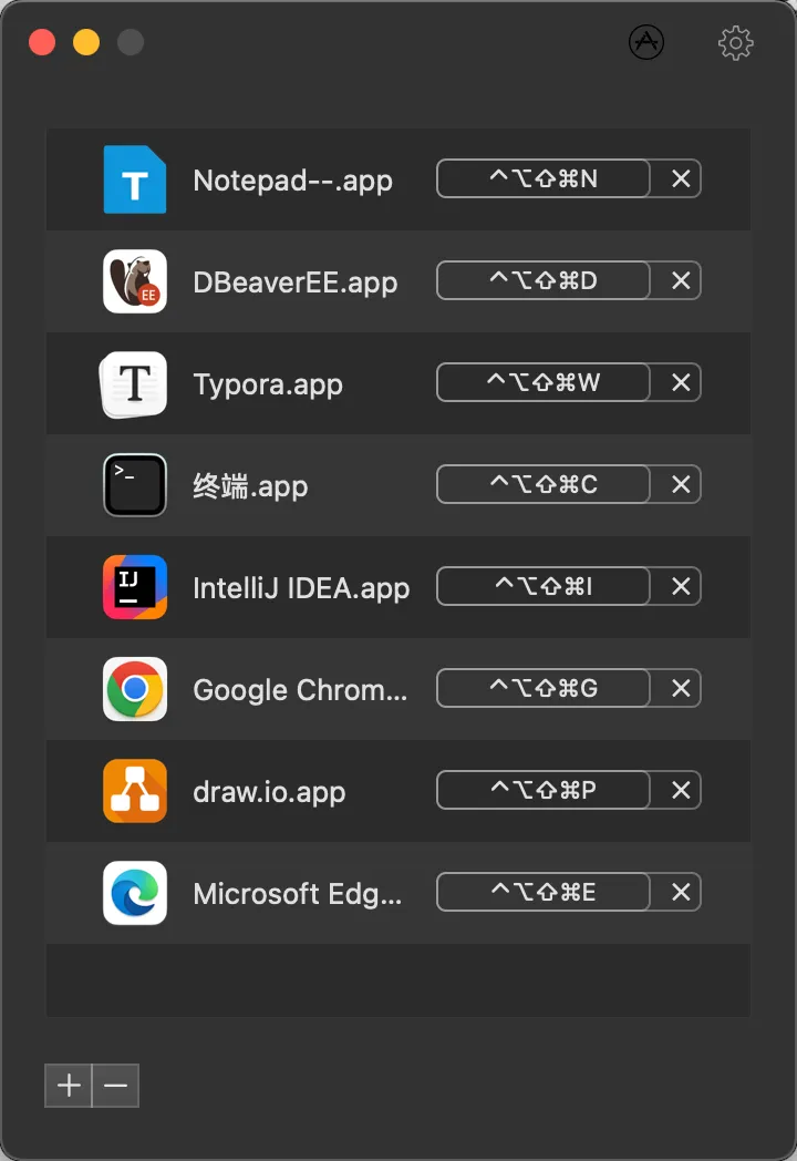 在app store完成程序安装之后,我们就可以直接完成程序快捷呼出、关闭的配置了,以笔者为例,基于上述步骤配置的F19键配合应用程序的首字母构成各种快捷呼出: