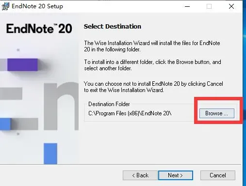 4、点Browse修改安装路径,比如我这里设置了D盘的endnote文件夹,这里切记一定要记住你的安装位置,一会需要回到这个位置。