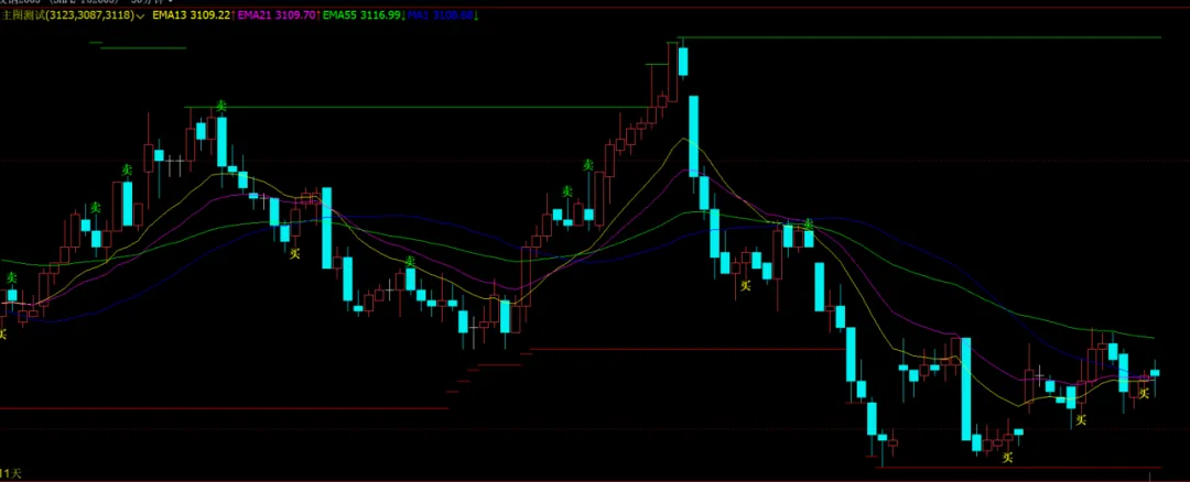 DRAWTEXT(REF(C,1)<D1 AND C>D1 AND D1<REF(D1,1),L,’买’),COLORYELLOW,VALIGN0,FONTSIZE15;