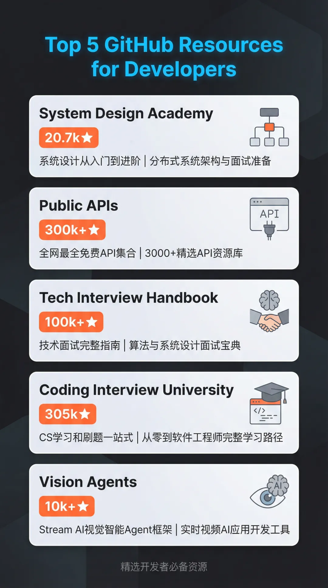 整理了5个软件工程师必收藏的GitHub仓库,从系统设计到技术面试,从API集合到AI视觉,这些资源基本覆盖了工程师成长的全路径。