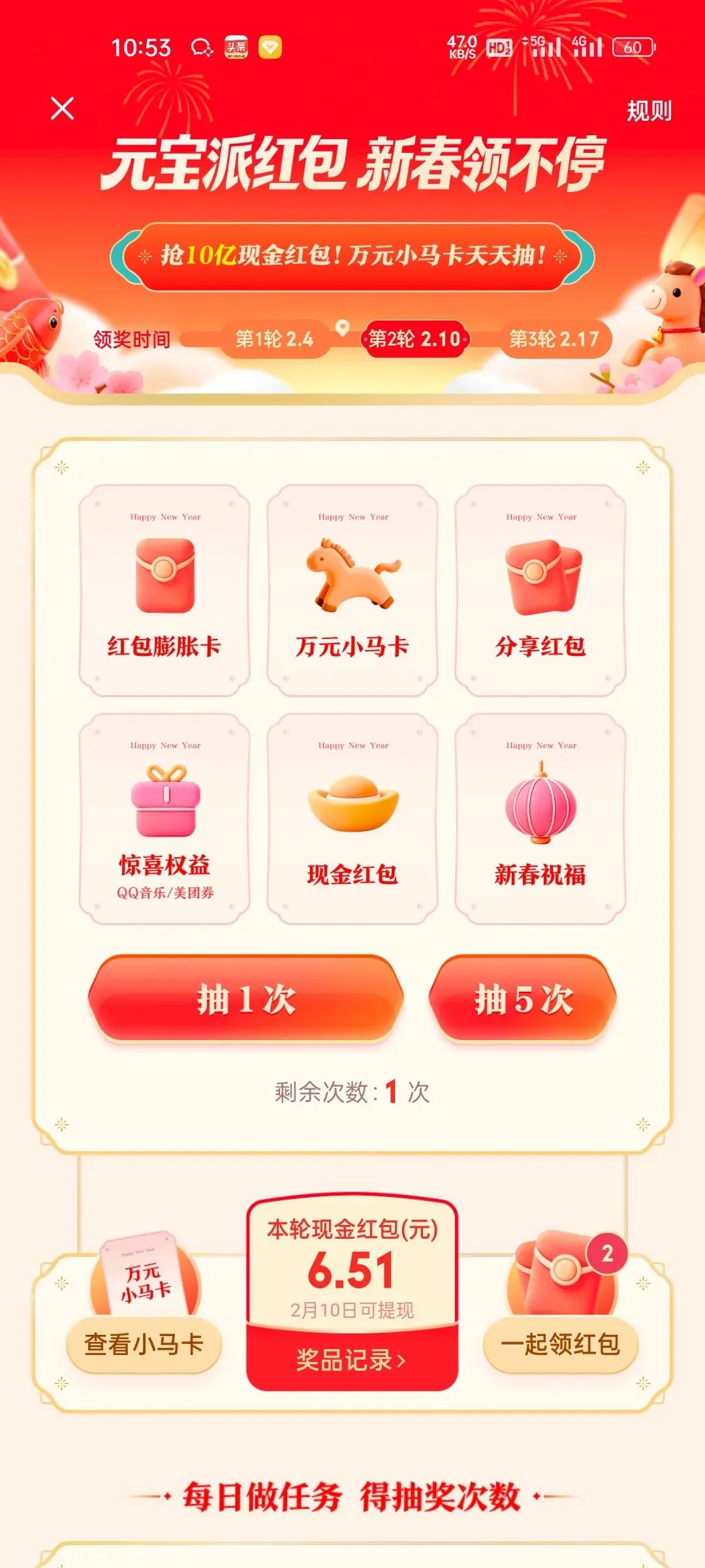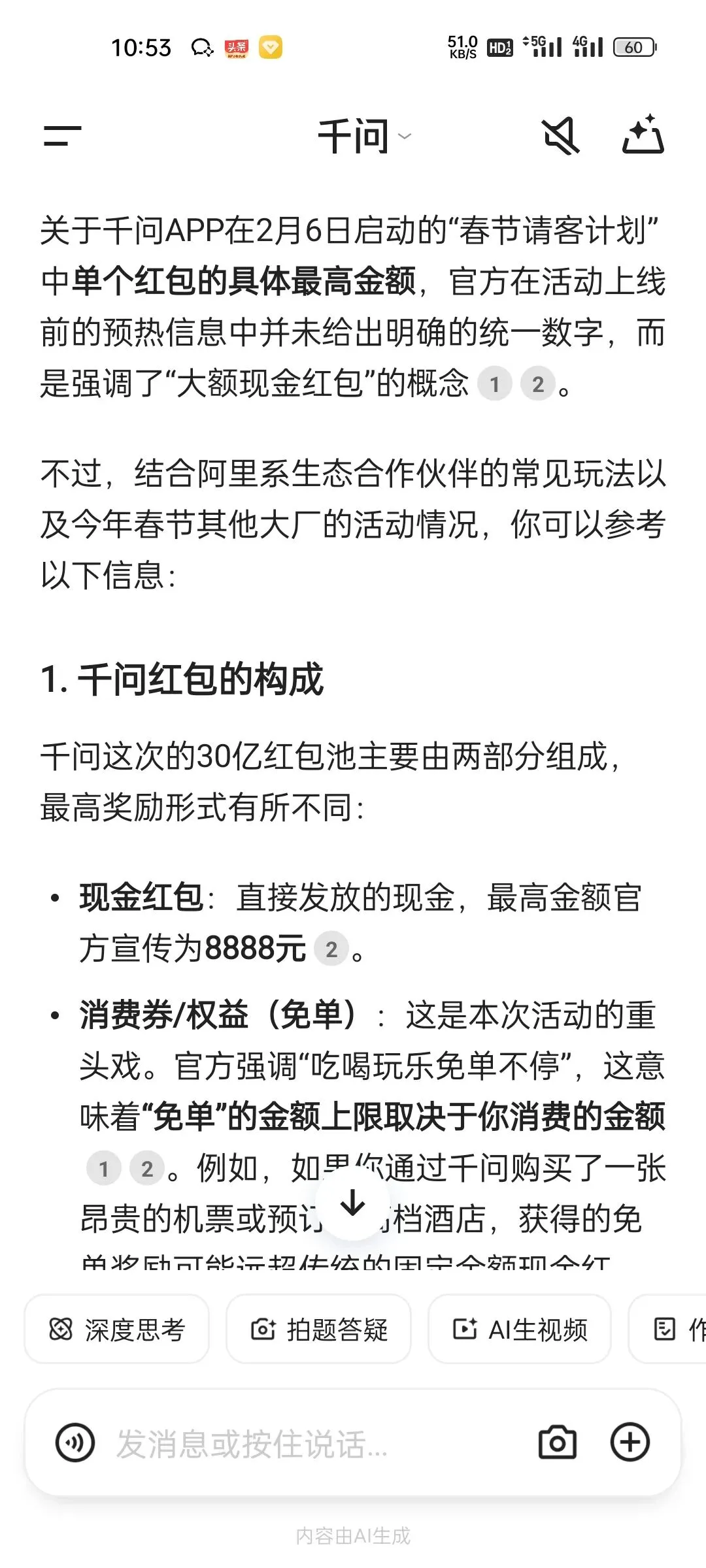 2月1日,元宝APP的10亿现金红包刚拉开战幕,我混在几亿人里指尖翻飞,最后揣着五块多钱的“战果”,换了个热腾腾的肉包子。包子的香气还没散尽,2月2日,千问APP的30亿“春节请客计划”又砸了过来,免单、吃喝玩乐、万元红包,一连串关键词砸得人头晕目眩,仿佛刚看完一场烟火,又被推上了另一场狂欢的舞台。