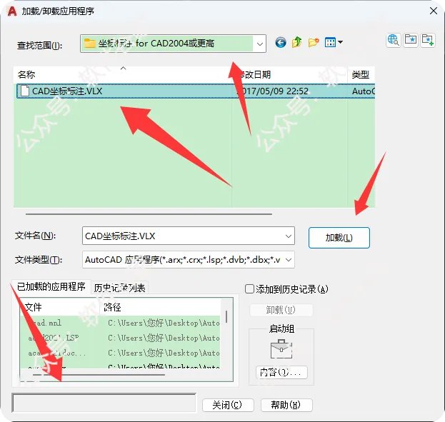 启动AutoCAD→命令行输入appload→回车→浏览选中“zbbz.vlx”→点击“加载”。