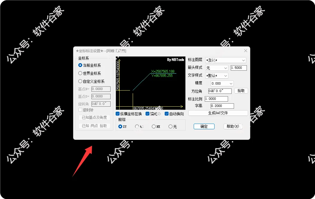 命令行输入ZBBZ→回车→弹出设置窗→设定图层、字体、箭头样式→点击“确定”即可开始标注