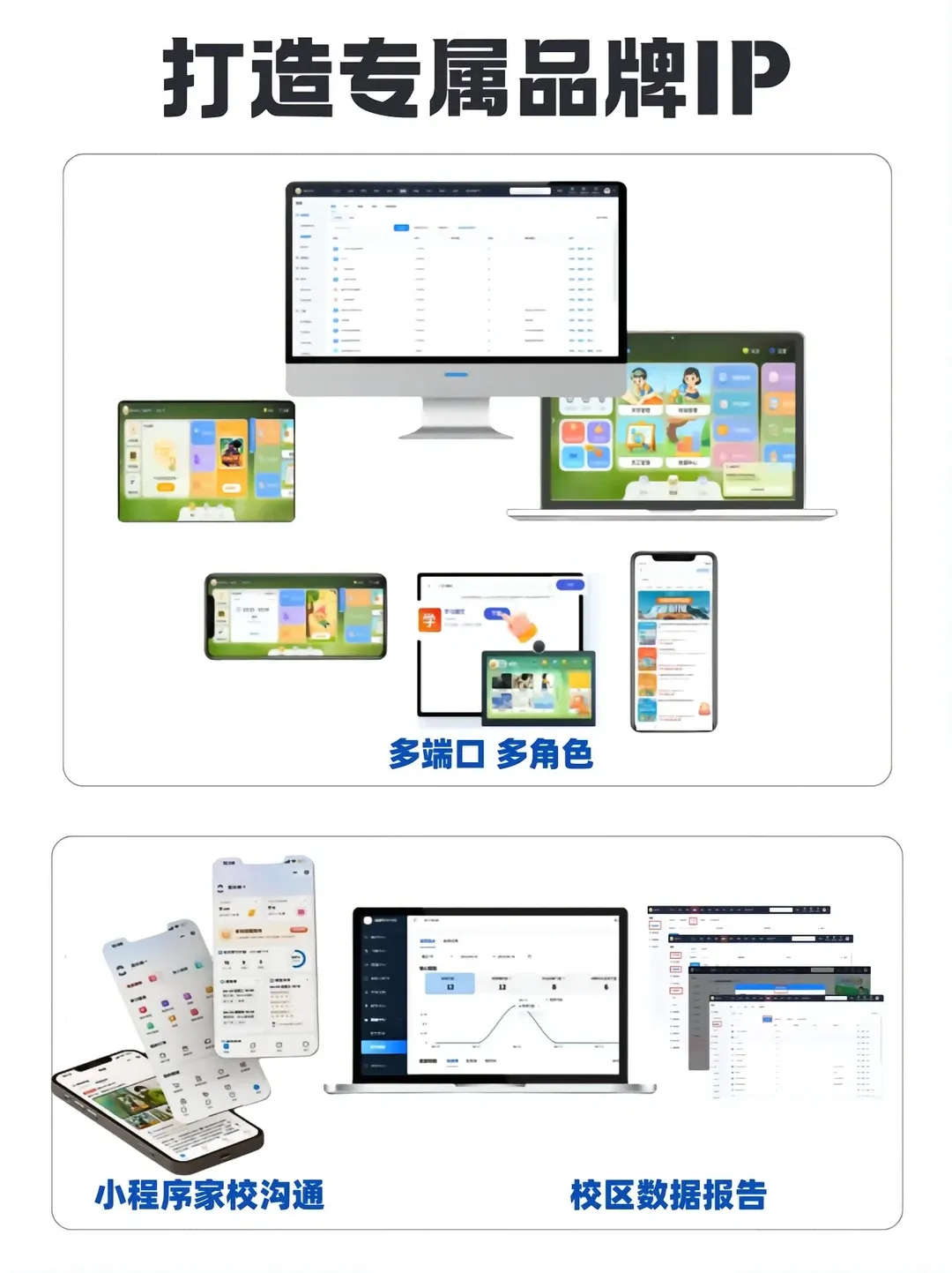 多端口适配,同步打造机构专属 IP,配套家校沟通、校区数据报表,实现品牌标准化 + 管理可视化。