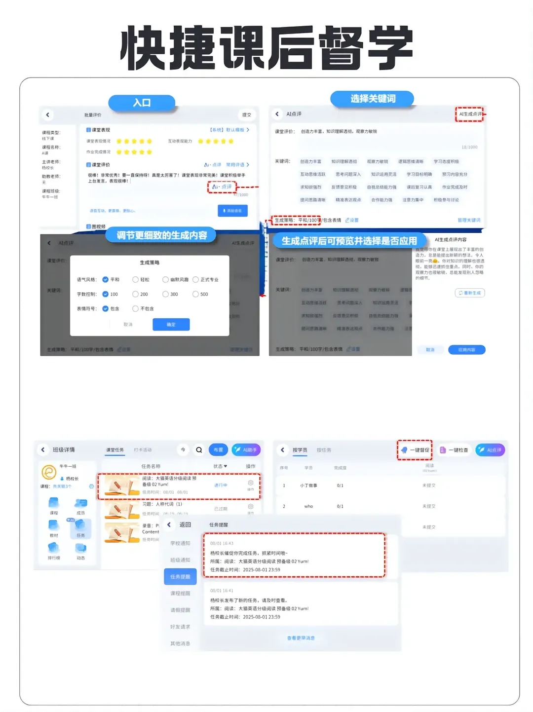课后督学:AI 自动生成点评、一键布置作业,同步学情。