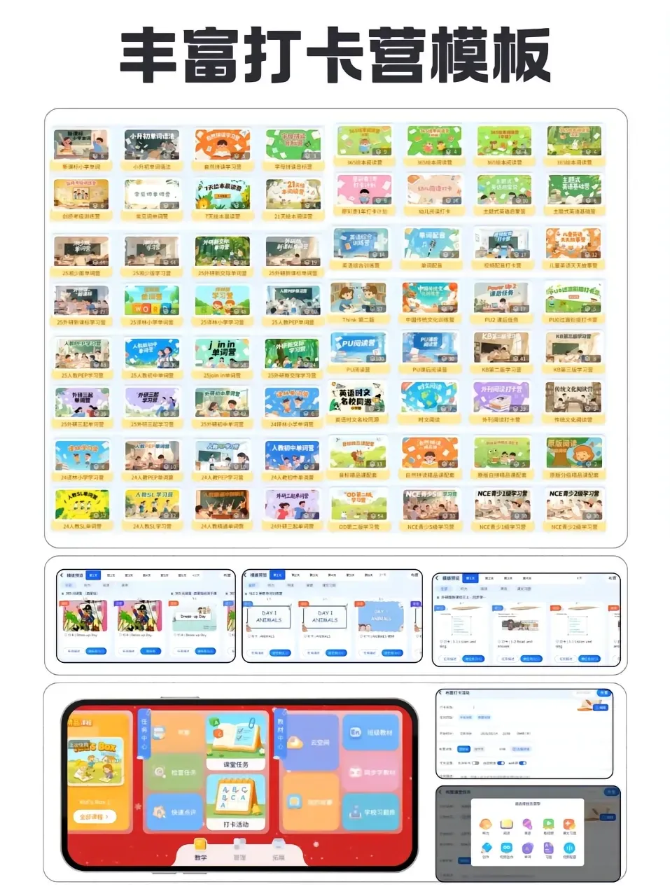 海量主题打卡模板 + 全套运营物料(方案 / 海报 / 话术),快素落地教材同步、课外阅读等活动。