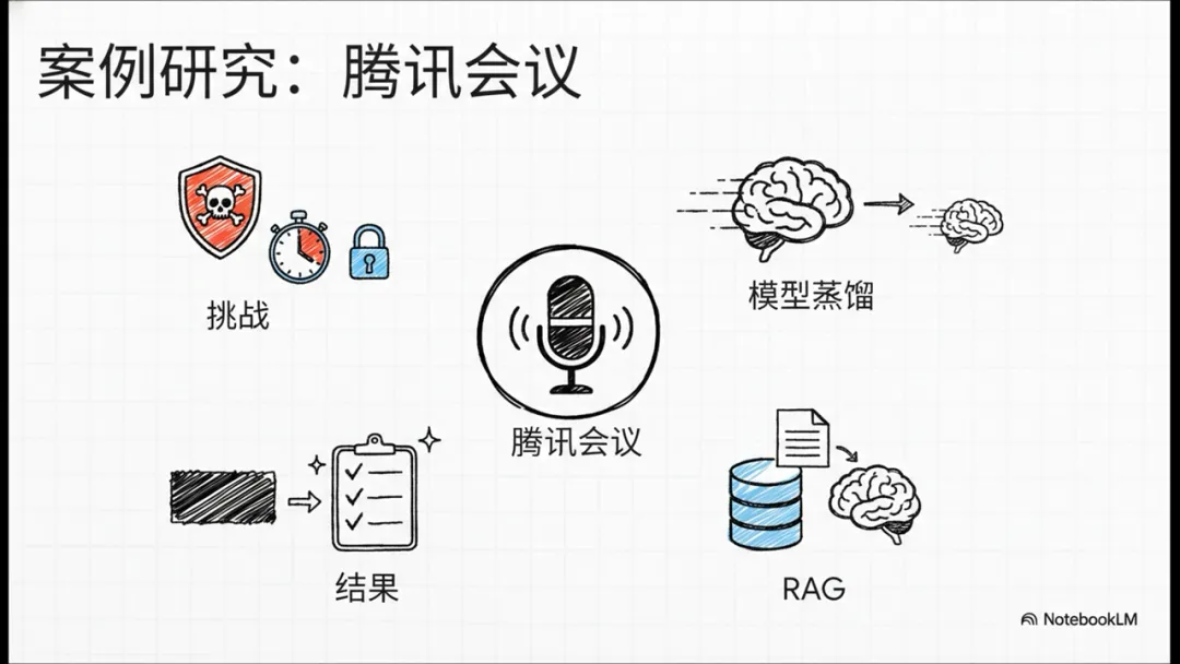 • 腾讯会议:开会要求响应快、隐私强。他们没直接用庞大的通用模型,而是用了“模型蒸馏”技术。好比让一个知识渊博的博士(大模型),手把手教出一个专注的“徒弟”(小模型)。这个“徒弟”只学怎么开会、做纪要,所以做得又快又好,让AI纪要功能就像会议天生自带的一样。