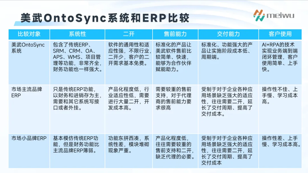 传统管理软件,止于系统上线,培训交付即验收,业务成败多归因为“使用不当”,与自身价值脱钩;而美武软件坚信,不敢对业务结果负责的AI,皆为花瓶摆设。我们将核心AI算法深度嵌入业务主干流程,把隐性决策逻辑显性化、标准化、模型化,让系统自主输出决策、直接触发执行,用技术穿透管理壁垒,从根源保障业务成效。