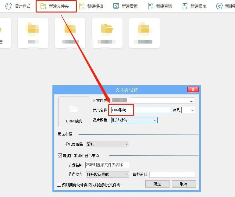 2. 点击【新建文件夹】,并命名为:CRM系统,点击【确定】;