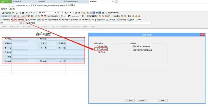 7.先选中表格的全部内容,再点击【定义基本信息】,进入数据项设置,点击【左侧单元格】,然后点击【下一步】;