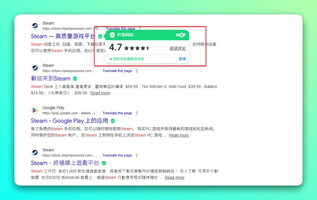 ✅ 2.安装「WOT: Website Security & Safety Checker」插件,其数据库覆盖全球超 1 亿个网站,安全检测准确率达 96.3%,能通过用户评分和安全检测标记可疑虚假网站,帮你快速筛选出靠谱的官网链接。安装好后,安全网站就会出现一个绿色的标记,不过实测不支持某度搜索引擎。