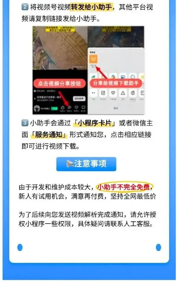 * 处理完成后,会通过微信小程序方式给您发送可直接下载或在线观看的高清无水印视频链接/文件。