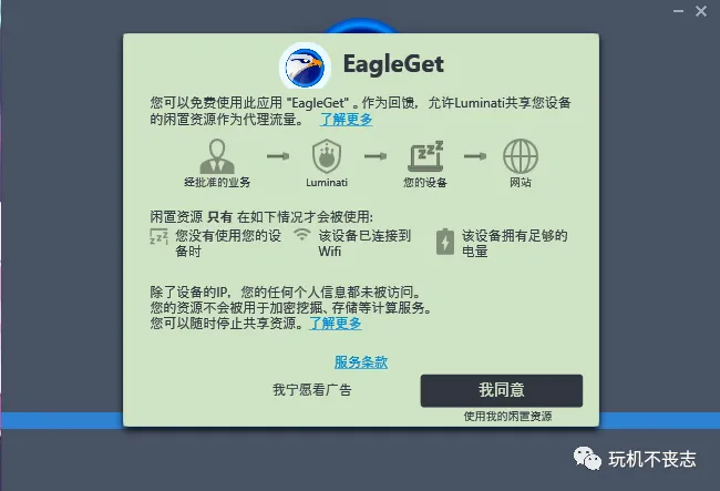 大家在下载的时候会显示这样一张图片,是要共享设备资源的,也就是网络,介意的小伙伴可以选择下面的我宁愿看广告。