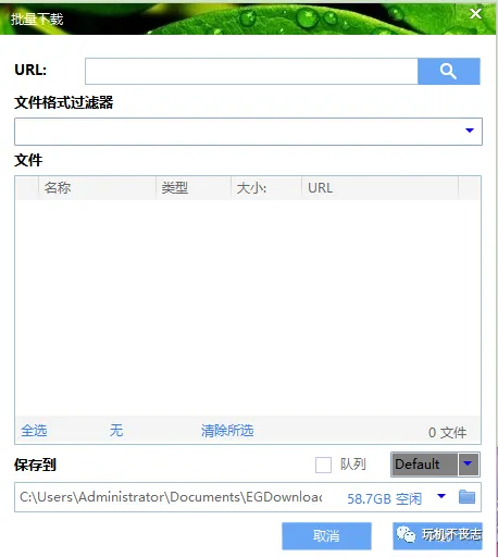 4、有一个批量下载的选项卡,在这个里面我们可以一次性添加多个URL地址,同时下载多个文件。