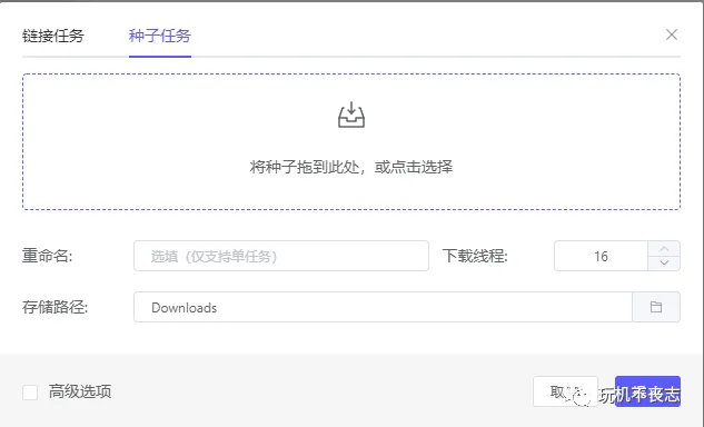 3、也可以下载种子任务,将种子拖到此处或点击选择进入文件夹添加种子文件。