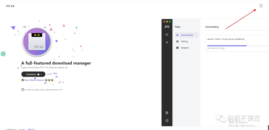 3、如果需要下载百度百度网盘资源,就需要在chrome浏览器安装扩展Motrix程序,先进入Motrix官方网站,点击右上角的“三杠”菜单。
