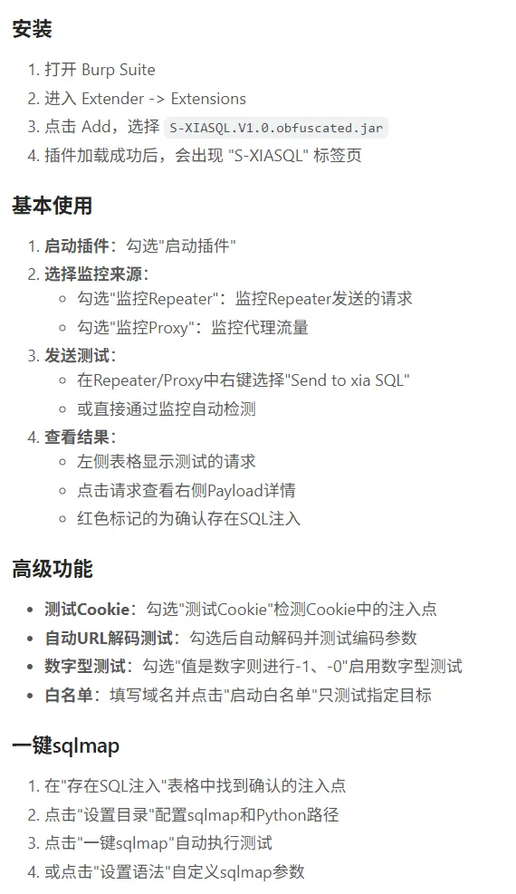 S-XIASQL 是一款专业的 Burp Suite SQL注入检测插件,能够自动化检测Web应用中的SQL注入漏洞。通过智能分析HTTP请求响应,快速识别潜在的SQL注入点,大幅提升渗透测试效率。