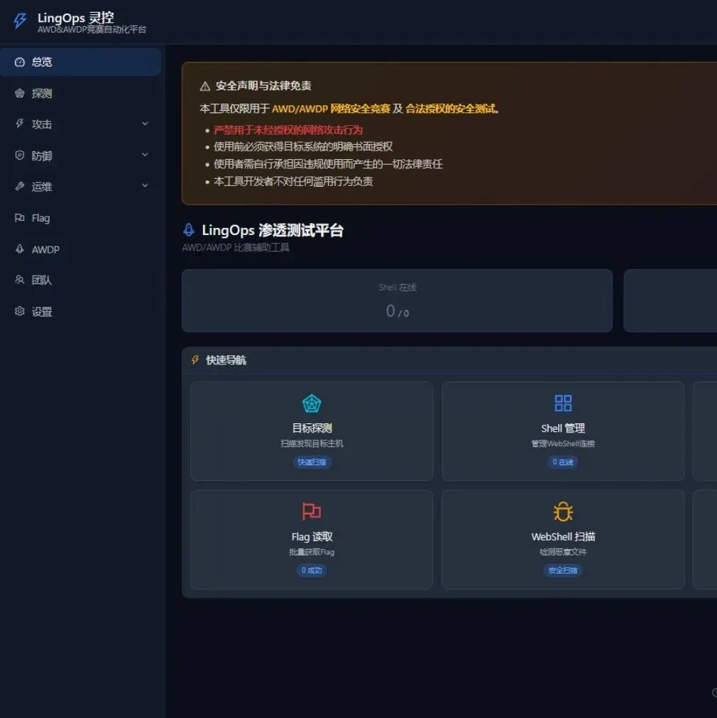 一个专为 AWD/AWDP 设计的竞赛自动化平台,提供 IP探测、WebShell 管理、SSH 终端、基线加固、Flag 读取等核心功能