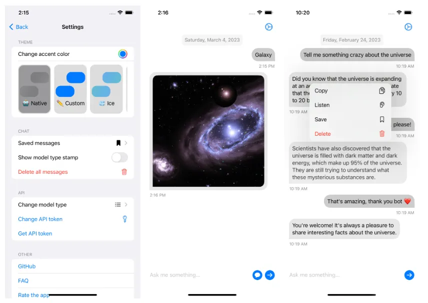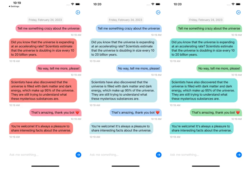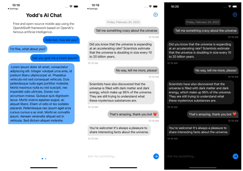 该代码使用 Swift 5 编写,适用于 iOS 15.0 及更高版本,目前仅支持 iPhone,但即将推出 iPad 和 Mac 版本!代码由我一人编写。它基于外部库,用于管理与不同人工智能聊天服务提供商的 API 调用。该应用完全使用 SwiftUI 开发,并针对 iOS 16 进行了优化,相比其他版本拥有更多改进。