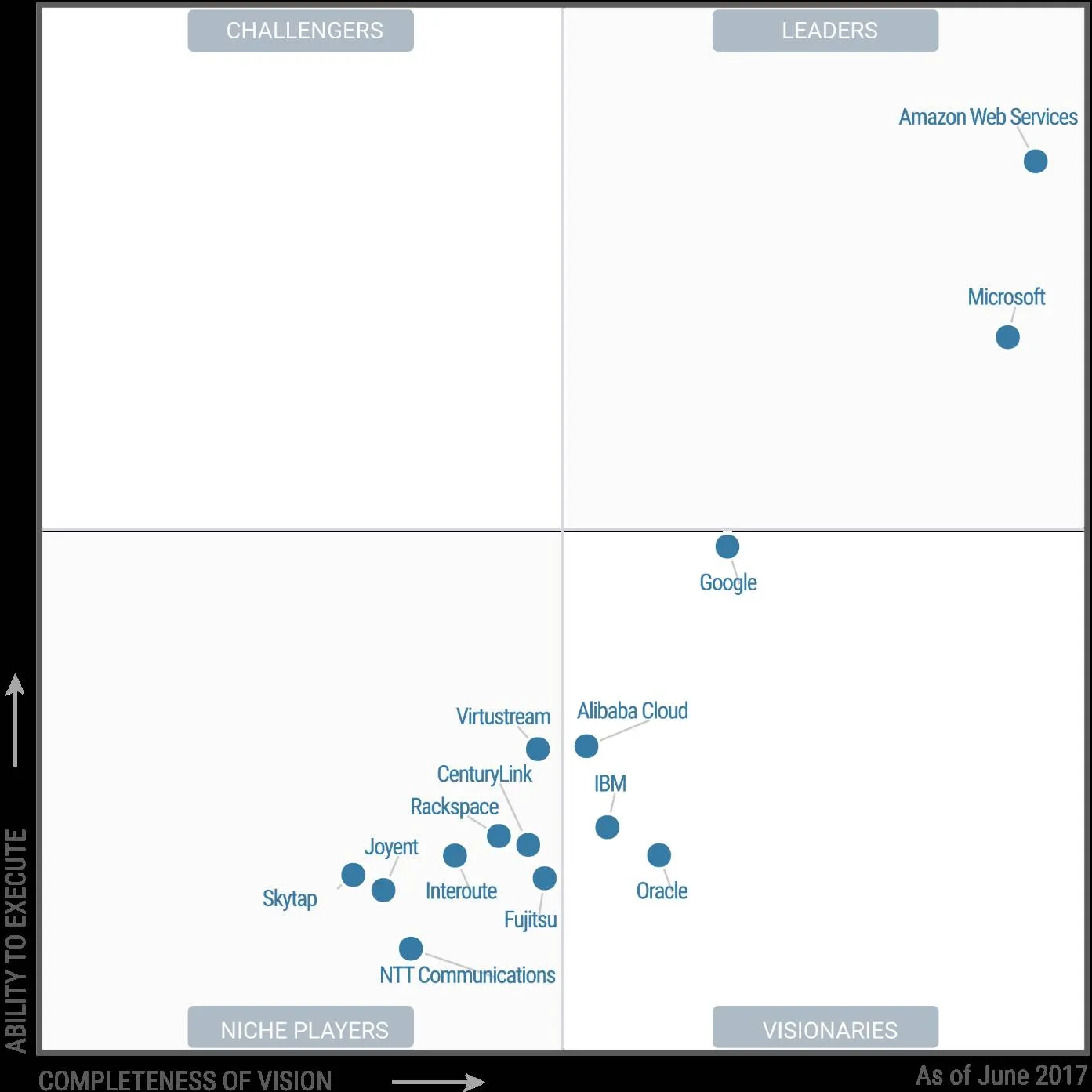 Gartner 发布了最新的 IaaS 云厂商魔力象限报告,AWS 和微软仍然是领军者,处于“领导者(Leaders)”象限,而 Google 处于“愿景者(Visionaries)”象限,阿里巴巴、IBM 和 Oracle 紧随其后。