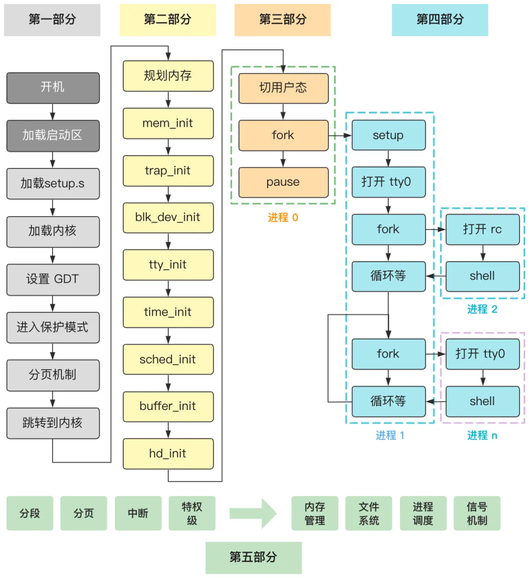 第二部分:大战前期的初始化工作。讲述 main 方法中的各种初始化函数,这些函数是操作系统各个模块的交互桥梁,为理解后续操作系统各个模块的运作原理打好基础。