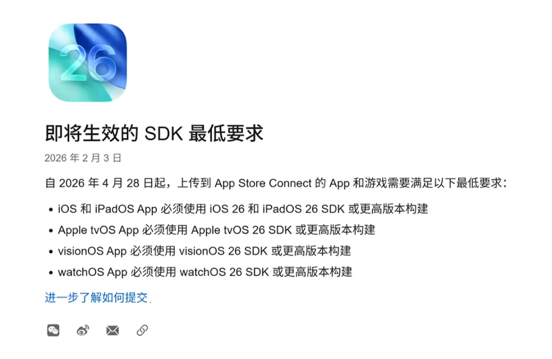所有新提交应用,均须基于 iOS 26 或更高版本 SDK 构建。这意味着什么?