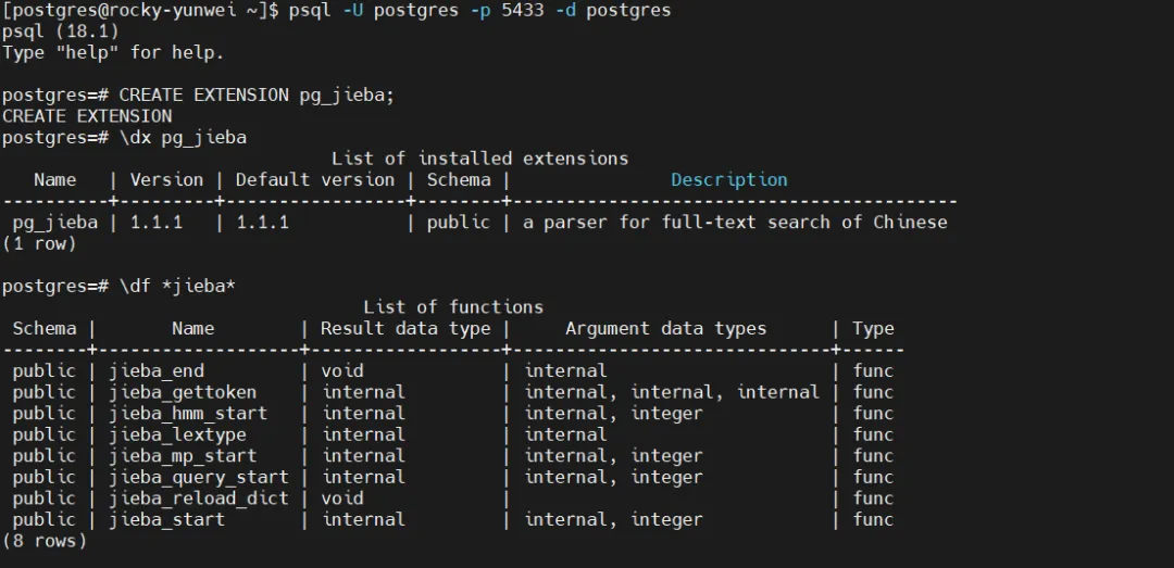 ('中文全文检索技术', 'pg_jieba 是一个基于结巴分词的PostgreSQL中文全文检索扩展插件'),