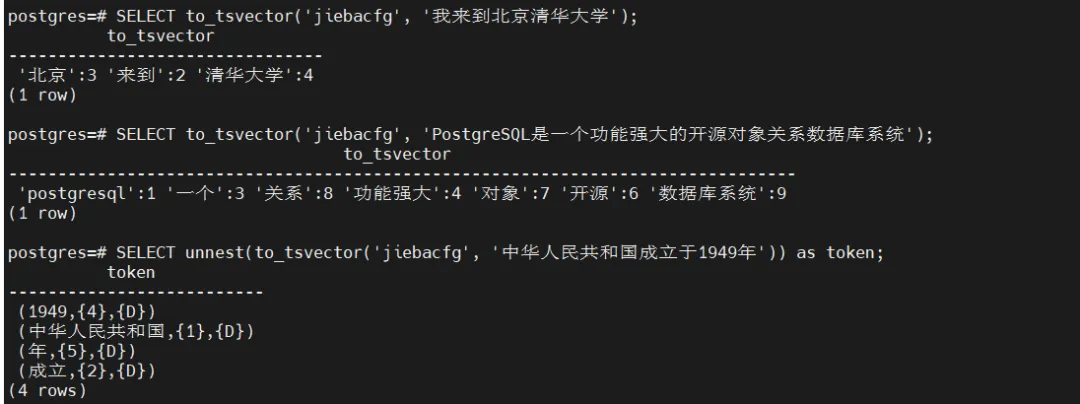 SELECT to_tsvector('jiebacfg', 'PostgreSQL是一个功能强大的开源对象关系数据库系统');