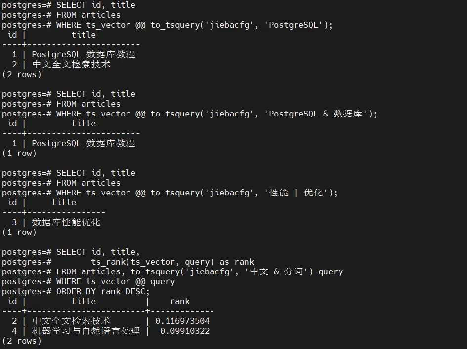 WHERE ts_vector @@ to_tsquery('jiebacfg', 'PostgreSQL & 数据库');